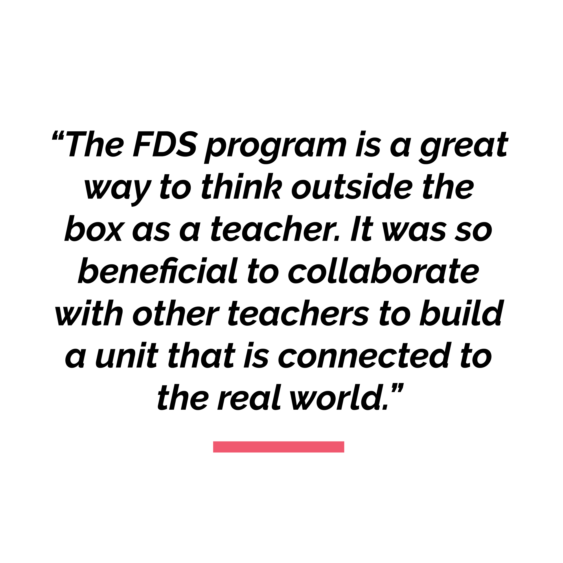 This 16 week program includes two mandatory Google Hangouts on Wednesday, January 15th from 4:00pm - 5:00pm EST and Wednesday May 6th from 4:00pm - 5:00pm EST. In between, participants will work through a series of activities and online conversations, with bi-weekly office hours hosted by FDS Facilitators. Collaboration between participants is structured so that teachers have many opportunities to connect with other inspiring educators!